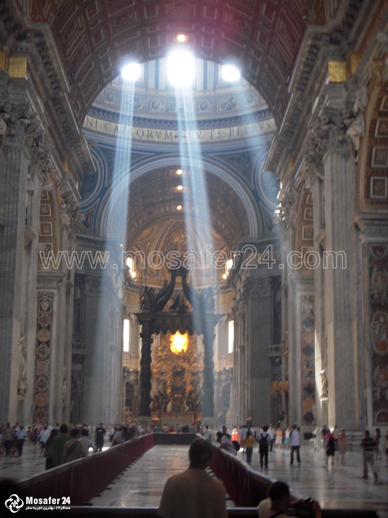 ورودی کلیسای جامع سن پیتر رو به میدان سن پیتر قرار دارد. این میدان شکلی بیضی مانند دارد و در دو طرف شمال و جنوب این میدان، دو فواره بزرگ و زیبا ساخته شده اند. اطراف این میدان فوق العاده جذاب، با ستون ها که روی آنها مجسمه هایی از قدیسین دین مسیحیت قرار دارند، مزین شده است. این میدان طراحی بسیار باشکوهی دارد و کلیسای سن پیتر نیز بر زیبایی آن افزوده است. طراح میدان سن پیتر، هنرمندی به نام برنینی است. او ساختمانی که در دوره رنسانس با همان سبک معماری ساخته شده بود را با معماری باروک به محیط پیرامونش پیوند داده است. کار این هنرمند بسیار قابل تحسین و خیره کننده است. بیش از یکصد و 40 مجسمه از افراد مقدس بر بالای ستون های دور میدان گذاشته شده است. از جمله آنها می توان به مجسمه های سن پل و سن پیتر که قدیسین رم هستند، اشاره کرد. این مجسمه ها در نزدیکی پله های قصر سلطنتی قرار داده شده اند. گردشگران از دیدن این کلیسا لذت می برند و به همین دلیل افراد بسیاری از آن دیدن می کنند. در داخل کلیسا، انواع آثار هنری دوره رنسانس و یادبودها و مجسمه های فوق العاده زیبایی از میکل آنژ را می توان مشاهده کرد. اگر از آسمان که نگاه کنیم، ساختمان‌ کلیسای سن پیتر به شکل یک کلید طراحی شده است. این کلید، نماد کلید بهشت است و مجسمه‌های حواریون مسیح نیز به شکل نیم دایره‌ در اطراف درب ورودی این کلیسا نصب شده ‌اند.