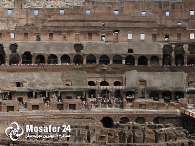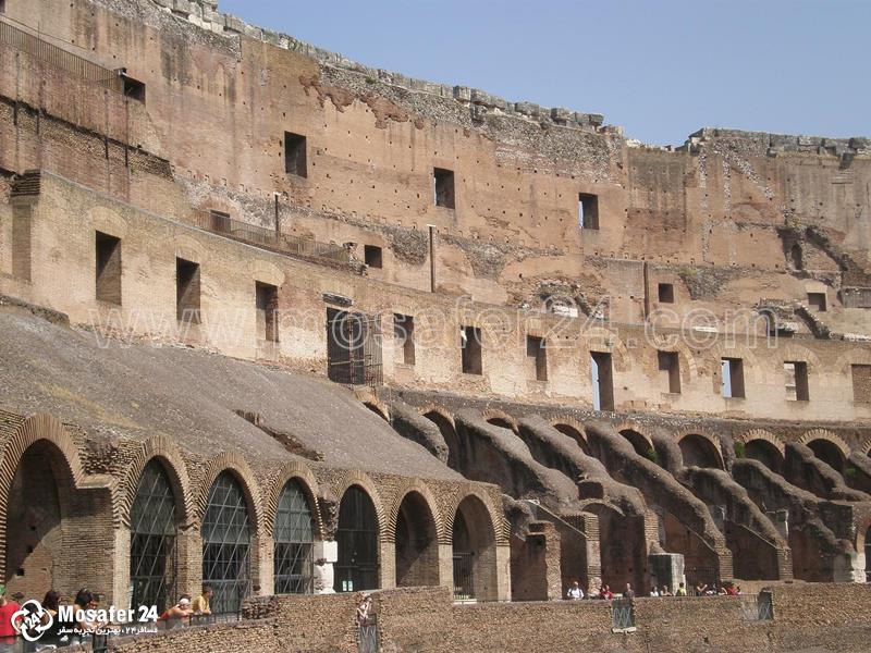 نمای داخلی کولوسئوم از بالا سه ردیف طاق‌های گنبدی شکل رو در روی ستون‌ها و سر ستون‌ها قرار گرفته‌اند، در ستون‌های طبقه اول سبک معماری سبک دوریکا، در طبقه دوم سبک ایونیک، و در طبقه سوم سبک قرنتی که نزدیک به سبک کلاسیک یونان بود، به کار رفته‌است. این بنا به دلیل عبور و مرور آسان جمعیت به داخل و خارج میدان یکی از شاهکارهای مهندسی است در بالای این سه طبقه اصلی، طبقه زیرشیروانی شامل ستون‌های مستطیل شکل سبک قرنتی قرار دارد، فضای بین ستون‌ها با 40 عدد پنجره کوچک مستطیل شکل پر شده‌است. در قسمت بالا، دیوارکوب‌ها و بندگاههایی وجود دارد که تیرک‌هایی را که سایه بان‌ها به آنها آویزان است، نگه داشته‌اند.