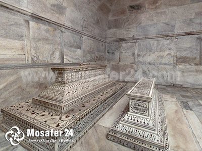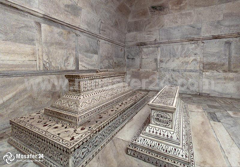 او را تا مدتی در برهانپور و در کرانه رود تپتی در باغ زین‌‏آباد گذاشتند، سپس به آگرا آورده و در آنجا به خاک سپردند. بی درنگ مزاری یا گنبدی موقتی بر آن ساختند و آنگاه آرامگاهی فلک‏آسا بر روی آن برپا داشتند که امروزه به نام تاج محل مشهور است. این بنا به سبب صفات ممتاز معماری و طرفه ‏کاریهایی که در آن شده، به عنوان یکی از عجایب جهان شناخته می‏شود.