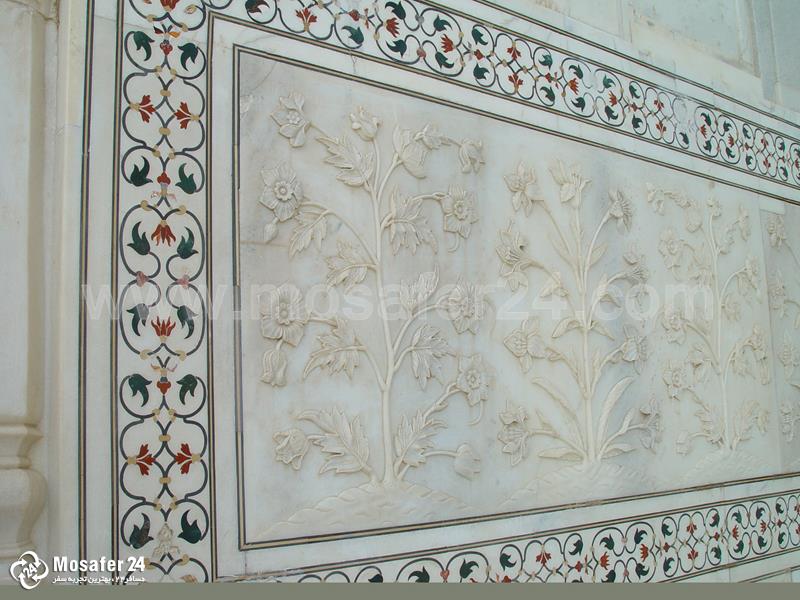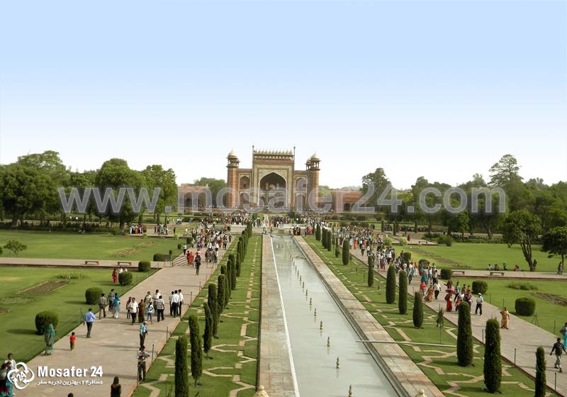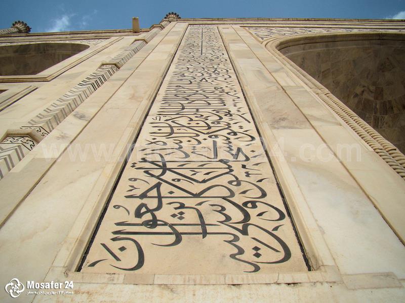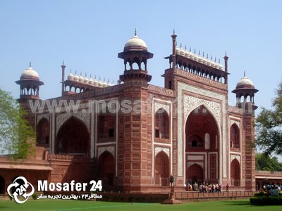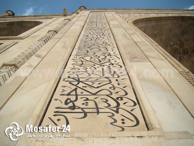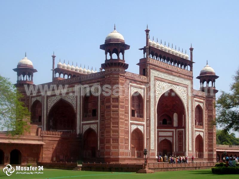 مدخل بنای تاج محل یک دروازه عظیم است که با سنگ سرخ ساخته شده و به سردرهای ایرانی بسیار شباهت دارد. در سه طرف مدخل این دروازه به سبک صفوی آیات قرآنی به خط امانت خان نوشته شده است.